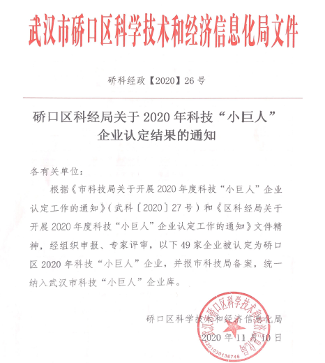 近日,武漢市硚口區(qū)科學(xué)技術(shù)和經(jīng)濟(jì)信息化局公示了《2020年硚口區(qū)科技“小巨人”企業(yè)認(rèn)定名單》。作為智慧化綜合管理解決方案提供商,斯艾特科技經(jīng)過組織申報(bào)與專家評(píng)審?fù)ㄟ^,被認(rèn)定為硚口區(qū)2020年科技“小巨人“企業(yè)。這是斯艾特科技繼獲得“高新技術(shù)企業(yè)”、“中國(guó)安防百?gòu)?qiáng)工程商”等榮譽(yù)后又一具有技術(shù)含量的殊榮。